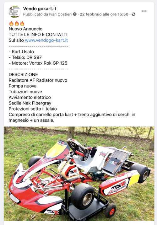 Nella foto sotto riporto un esempio di un kart che ho messo in vendita nella mia pagina FB.